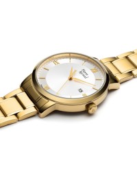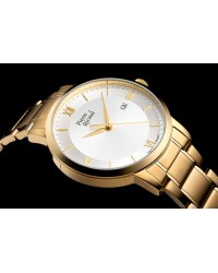 Die Pierre Ricaud P97239.1163Q Gent Uhr ist ein zeitloses Stück klassischen Designs. Das Gehäuse mit 42 mm Durchmesser ist aus hochwertigem Edelstahl gefertigt, was ihm einen attraktiven Goldton verleiht. Das Gehäuse hat eine Dicke von 10 mm, wodurch es unauffällig und angenehm zu tragen ist. Das Zifferblatt verfügt über ein klassisches Silber-Finish, das dafür sorgt, dass dieses Stück auffällig und dennoch elegant ist. Das Zifferblatt ist durch ein Mineralglasfenster geschützt, das Haltbarkeit und Klarheit bietet.