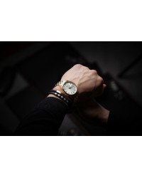 Męski zegarek kwarcowy Pierre Ricaud to połączenie elegancji, funkcjonalności i wysokiej jakości wykonania. Koperta oraz bransoleta zbudowane są z drobnych ogniw wykonanych ze stali szlachetnej, co zapewnia zarówno trwałość, jak i wyrafinowany wygląd. Sercem zegarka jest precyzyjny mechanizm Seiko Epson VX63, który odpowiada nie tylko za dokładne wskazanie czasu, ale również za funkcję prezentacji dnia tygodnia i miesiąca, umieszczoną w oknie na godzinie trzeciej. Zegarek posiada duże, wyraźne arabskie indeksy, które wyraźnie kontrastują z tarczą, gwarantując doskonałą czytelność w każdych warunkach. Szafirowe szkło skutecznie chroni przed zarysowaniami, a wodoodporność na poziomie 5 ATM zapewnia ochronę przed zachlapaniami i deszczem. To idealny model dla mężczyzn ceniących praktyczność, czytelność i klasyczny styl.