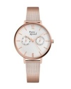 Odkryj elegancję i funkcjonalność z damskim zegarkiem Pierre Ricaud, który zachwyca ponadczasowym designem i praktycznymi funkcjami. Model posiada kopertę oraz bransoletę typu mesh wykonaną z wysokiej jakości stali szlachetnej, która doskonale układa się na nadgarstku, zapewniając komfort oraz stylowy wygląd w każdej sytuacji. Zegarek wyposażono w precyzyjny mechanizm Seiko Epson VX36, który gwarantuje niezawodne działanie i dokładny pomiar czasu każdego dnia. Zegarek posiada również mineralne szkło, chroniące tarczę przed zarysowaniami, oraz wodoodporność 3 ATM, dzięki czemu doskonale sprawdza się w codziennym użytkowaniu. Na czytelnej tarczy umieszczono smukłe indeksy liniowe oraz elegancki indeks rzymski na godzinie 12, co ułatwia szybki odczyt godziny i podkreśla klasyczny charakter czasomierza. Zegarek jest multifunkcyjny, posiada subtarcze wskazujące dzień tygodnia oraz miesiąca, które pomagają w organizacji dnia i dodają tarczy nowoczesnego, eleganckiego wyglądu. To idealny wybór dla kobiet ceniących elegancję, praktyczność i ponadczasowy styl, które szukają zegarka będącego zarówno biżuterią, jak i niezawodnym towarzyszem każdego dnia.