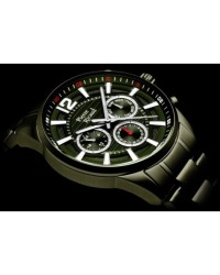Męski zegarek kwarcowy marki Pierre Ricaud to połączenie sportowej funkcjonalności i eleganckiego stylu w solidnej formie. Koperta oraz bransoleta wykonane są z dużych ogniw ze stali szlachetnej, co nadaje zegarkowi wyrazisty, męski charakter oraz zapewnia trwałość na długie lata. W jego wnętrzu pracuje precyzyjny mechanizm Seiko Epson VX9JE, gwarantujący niezawodne działanie i dokładność wszystkich funkcji. Tarcza zabezpieczona jest szkłem mineralnym, odpornym na zarysowania i uszkodzenia, a wodoodporność na poziomie 5 ATM chroni zegarek przed codziennymi zachlapaniami. Model wyróżnia się czytelną tarczą z nakładanymi indeksami liniowymi oraz cyfrą arabską na godzinie 12, nad którymi biegnie wyraźna skala minutowa. Subtarcze multifunkcyjne prezentują dzień tygodnia, dzień miesiąca oraz czas w formacie 24-godzinnym, co podkreśla praktyczny i nowoczesny charakter zegarka. Całość uzupełnia sportowy, a zarazem stylowy design, który doskonale sprawdzi się zarówno na co dzień, jak i w bardziej casualowych stylizacjach. To idealny wybór dla mężczyzn ceniących precyzję, wygodę i elegancję w nowoczesnym wydaniu.