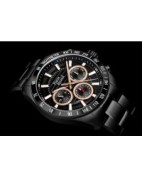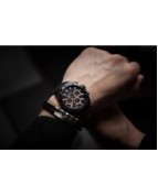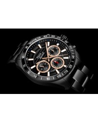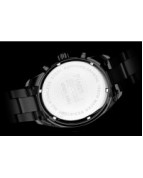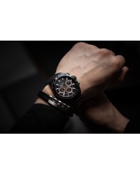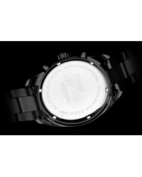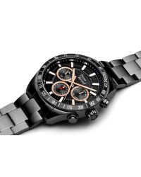 Męski zegarek kwarcowy o multifunkcyjnym charakterze to połączenie sportowego stylu, technicznej precyzji i solidnego wykonania. Koperta oraz bransoleta z dużych ogniw wykonane są z wysokiej jakości stali szlachetnej, co nadaje zegarkowi masywny, męski wygląd i zapewnia trwałość. W jego wnętrzu pracuje niezawodny mechanizm Seiko Epson VX9J, gwarantujący dokładne działanie wszystkich funkcji. Ochronę tarczy zapewnia wyjątkowo odporne szkło szafirowe, chroniące przed zarysowaniami i uszkodzeniami. Model posiada wodoszczelność na poziomie 10 ATM, dzięki czemu sprawdzi się również podczas aktywności sportowych. Tarcza zegarka jest czytelna i wyrazista – zdobią ją grube, nakładane indeksy oraz skala minutowa biegnąca wokół ich górnej krawędzi. Bezel ze skalą podkreśla techniczny charakter modelu, dodając mu dynamicznego wyglądu. Subtarcze multifunkcyjne prezentują dzień tygodnia, dzień miesiąca oraz czas w formacie 24-godzinnym, zapewniając pełną kontrolę nad upływem czasu. To zegarek stworzony dla mężczyzn, którzy cenią funkcjonalność, nowoczesny design i sportową elegancję w solidnym, precyzyjnie wykonanym wydaniu.